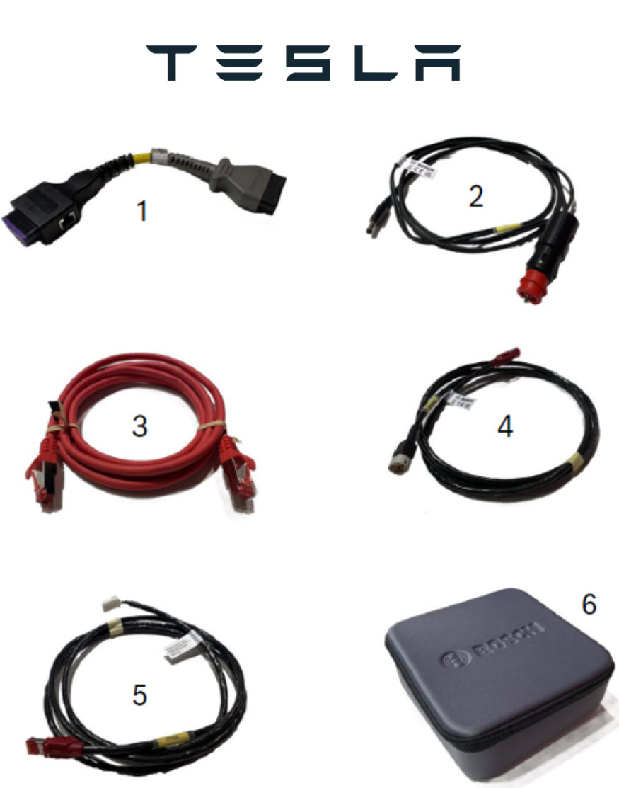 The KTS Tesla cable kit provides a complete set of diagnostic adapters for full Tesla vehicle diagnostics using your Bosch KTS tool and ESI[tronic] software. This cable set covers Model 3, Model Y, Model S, and Model X (all models except Roadster and Cybertruck).