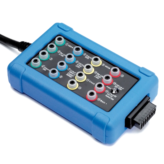 The CAN Test Box includes a 2.5 metre (8.2 feet) cable so that you can work in a convenient location away from the diagnostic connector, and an additional pass-through connector so that you can hook up your scan tool at the same time as your scope. The box is powered by the diagnostic connector, so no batteries or mains adaptor are needed.